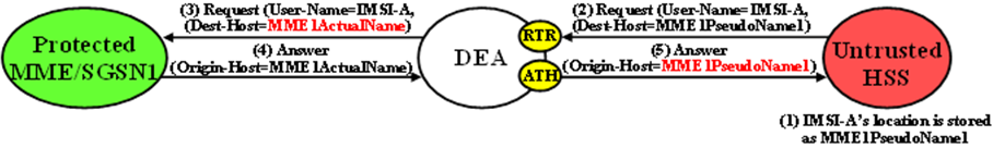 MME/SGSN identities are hidden by replacing the Actual Hostname portion of the Origin-Host and Session-ID AVPs (Session-ID format: <host name><implementation portion>) with an MME/SGSN Pseudo Hostname. The Origin-Host and Session-ID AVPs can have different MME/SGSN Hostnames. A unique Pseudo Hostname must be created for each MME/SGSN in a Protected Network. When the MME/SGSN initiates a transaction to the HSS, the HSS saves the MME/SGSN's identity for use in subsequent HSS-to-MME/SGSN transactions. This MME/SGSN Pseudo Hostname must not only be unique, but the DEA must be able to convert the MME/SGSN's Pseudo Hostname to an Actual MME/SGSN Hostname for these subsequent HSS-to-MME/SGSN transactions.