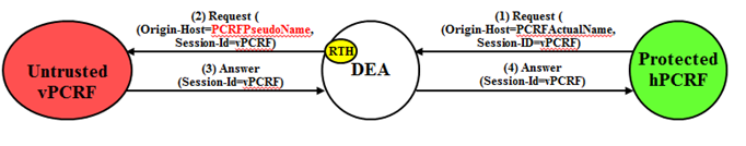 PCRF identities are hidden by replacing the actual host name portion of the Origin-Host and Session-ID AVPs with a PCRF pseudo-host name. The Origin-Hose and Session-ID AVPs may have different PCRF host names. A unique pseudo- name must be created for each PCRF in a Protected Network. When the vPCRF initiates a transaction to the hPCRF, the hPCRF saves the vPCRF's identity for use in subsequent hPCRF-to-vPCRF transactions. This vPCRF pseudo-host name must not only be unique, but the DEA must be able to convert the vPCRF's pseudo-name to an actual vPCRF host name for these subsequent hPCRF to vPCRF transactions.