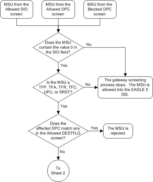 These network management messages are screened by the Allowed Affected Destination Field: TFP, TFA, TFR, TFC, UPU, and SRST (RSP, RSR). Any MSU that is not one of these network management message types, or does not contain a service indicator of 0 in the SIO field and reaches this screen in the gateway screening process automatically passes gateway screening and is allowed into the EAGLE.