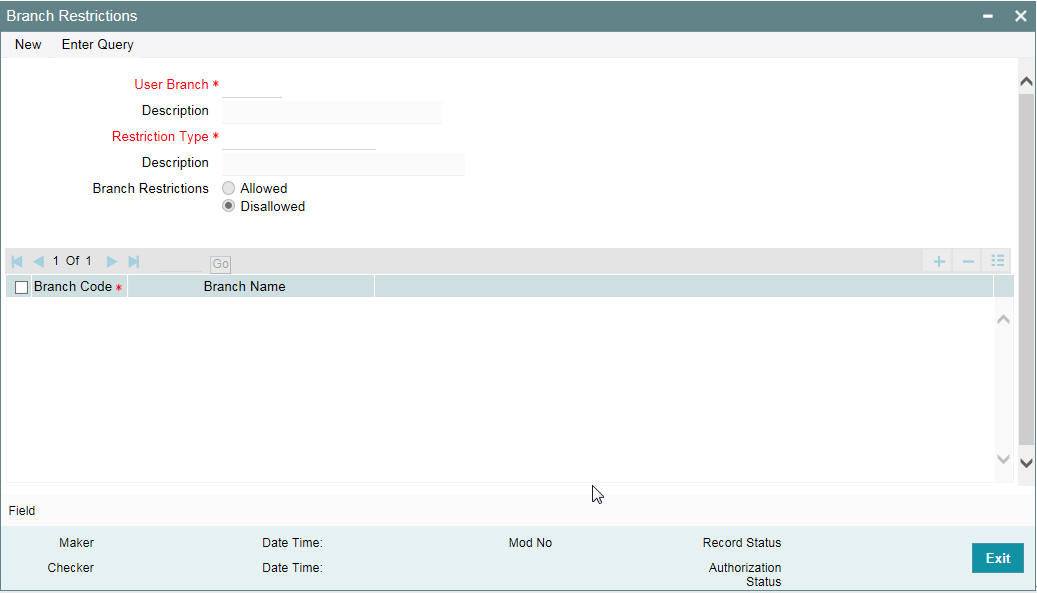 You can restrict administrators of branches from performing operations related to specific functions in branches other than their home branch. These are referred to as ‘Branch Restrictions for Specific Applications’. You can also maintain a list of branches in which the administrator of a certain branch is allowed / restricted to perform specific operations. These other restrictions are referred to as ‘Common Branch Restrictions’.
