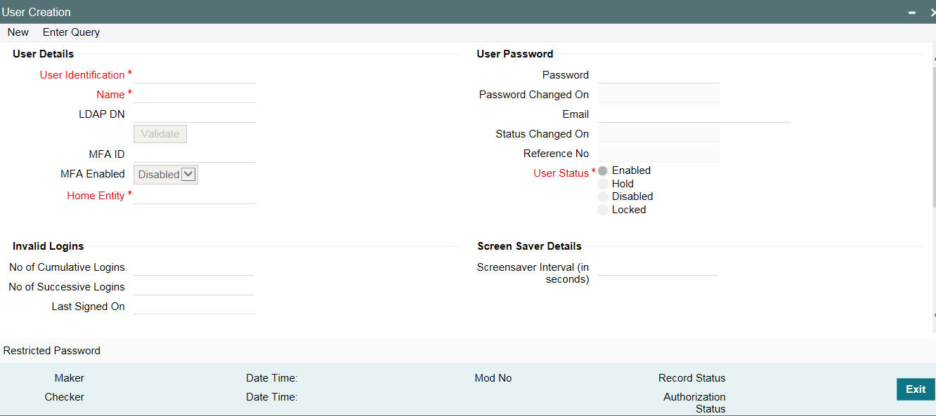 Oracle Banking Payments allows you to automatically disable the profile of all the users who have not logged into the system for a pre-defined period of time. A user ID is considered dormant if the difference between the last login date and the current date is equal to or greater than the number of ‘Dormancy Days’ that you specify in this screen. This is reckoned in calendar days i.e. inclusive of holidays.