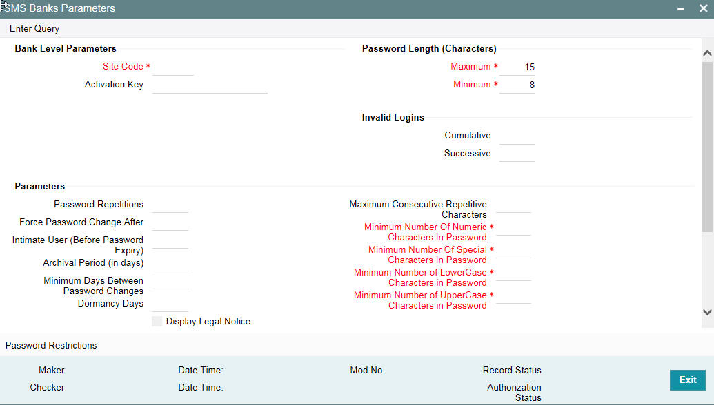 Certain parameters related to security management should be defined at the bank level. These parameters will apply to all the users of the system. Examples of such parameters are the number of invalid login attempts after which a user-id should be disabled, the maximum and minimum length for a password, the number of previous passwords that should not be used, the interval at which the password should be changed by every user, and so on..