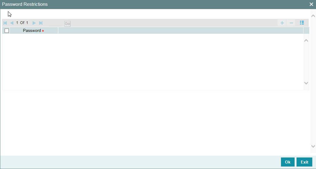 Click ‘Password Restrictions’ button to define restricted passwords at the bank level that should not be used by any user of the bank.