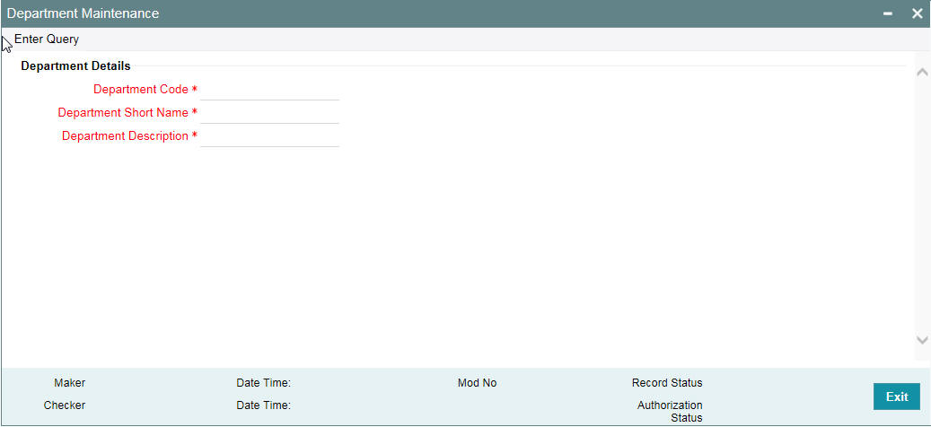 Oracle Banking Payments allows you to maintain department details in the system. However, only privileged administrative users can edit the department details. You can capture department details in the ‘Department Maintenance’ screen. You can invoke this screen by typing ‘SMDDPTMT’ in the field at the top right corner of the Application tool bar and clicking on the adjoining arrow button.