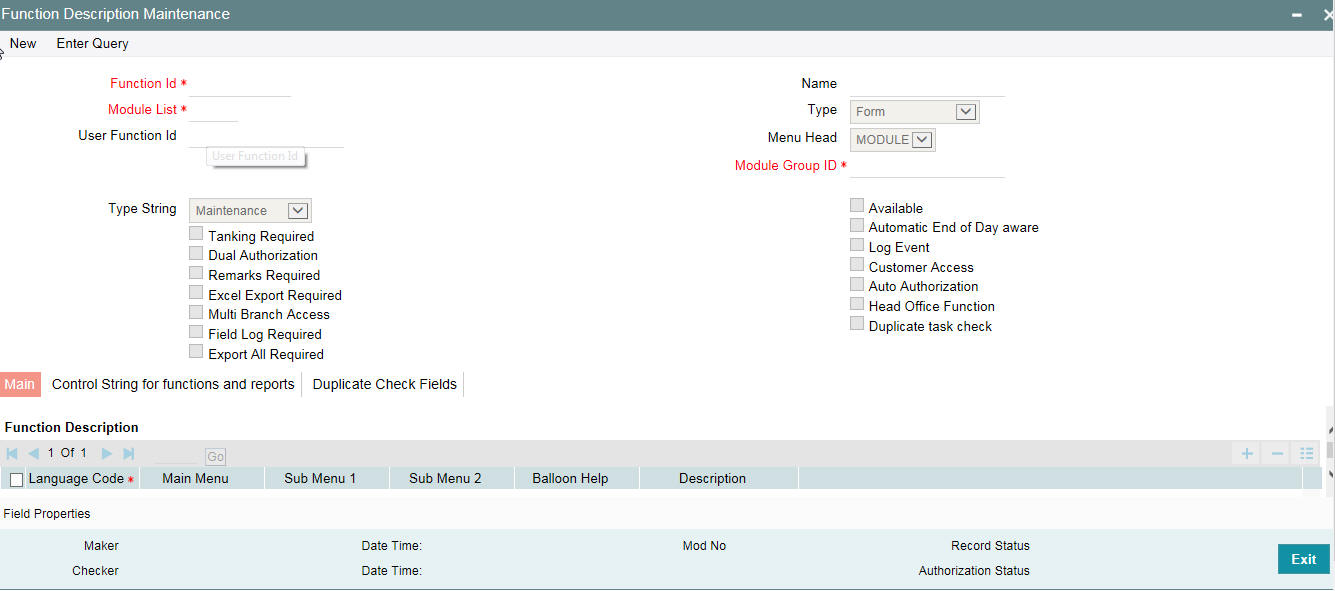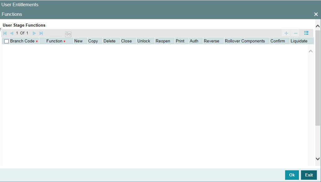 To add a function, click add icon. At Function Identification, you should select the function for which you want to give rights. The adjoining option list displays a list of Function IDs belonging to the category along with their descriptions. From this list you can pick up the function for which you want to give access rights by double clicking on it when it is highlighted. You can then specify the rights to the different actions for the functions by checking against the action.