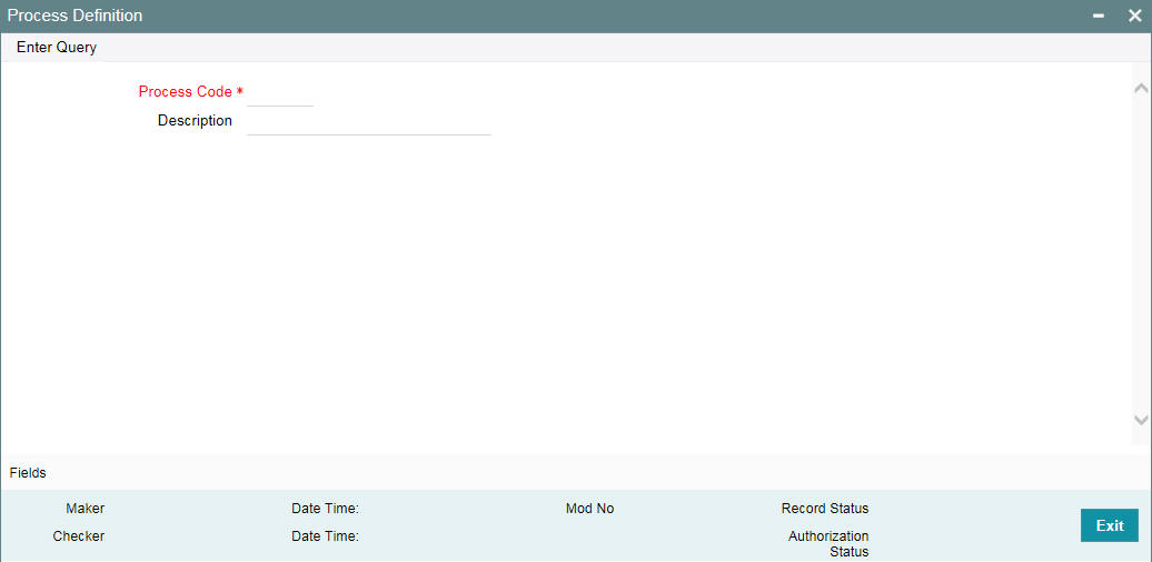 You can maintain the process codes using the ‘Process Definition’ screen. You can invoke this screen by typing ‘SMDPRCDE’ in the field at the top right corner of the Application tool bar and clicking on the adjoining arrow button.