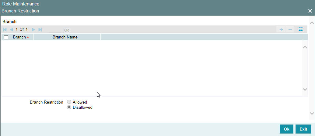 Specify the branch code assigned to the user role. The option list displays all the valid branch codes maintained in the system. You can choose the appropriate one.