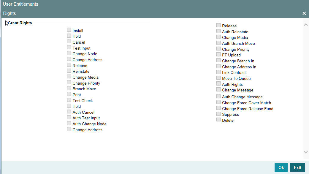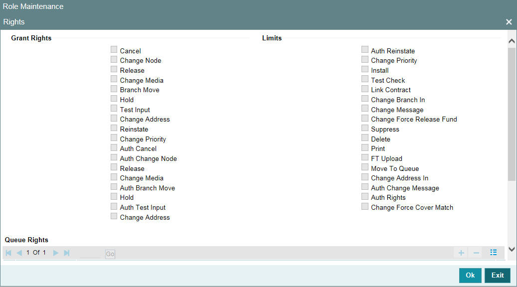 A user should have the necessary rights to perform various operations in respect of incoming and outgoing messages, in the Messaging module of Oracle Banking Payments You can grant specific permissions for operations on messages, as well as allot the messaging queues to which the user has access. In the User Maintenance screen, click ‘Rights’ button to grant these rights pertaining to the Messaging module, to the user.