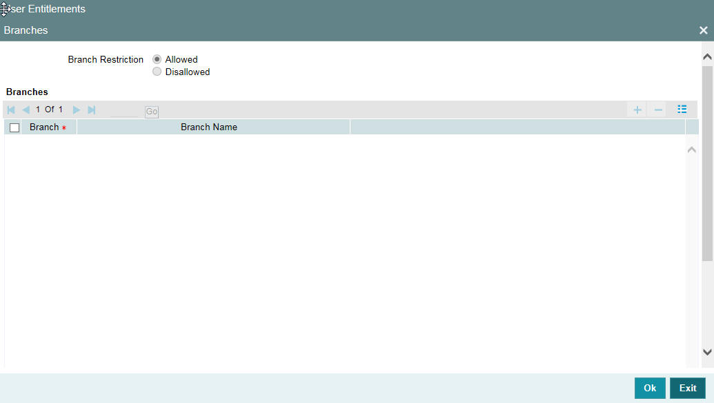 If you maintain an ‘allowed’ list, then the user profile will be available only for those branches that you specify in the Branch Restrictions list. Similarly, if you maintain a ‘disallowed’ list, then the user profile will not be available only for those branches that you specify in the Branch Restrictions list. Any branch that is ‘Disallowed’ will not appear to that user in his ‘Change Branch’ list.