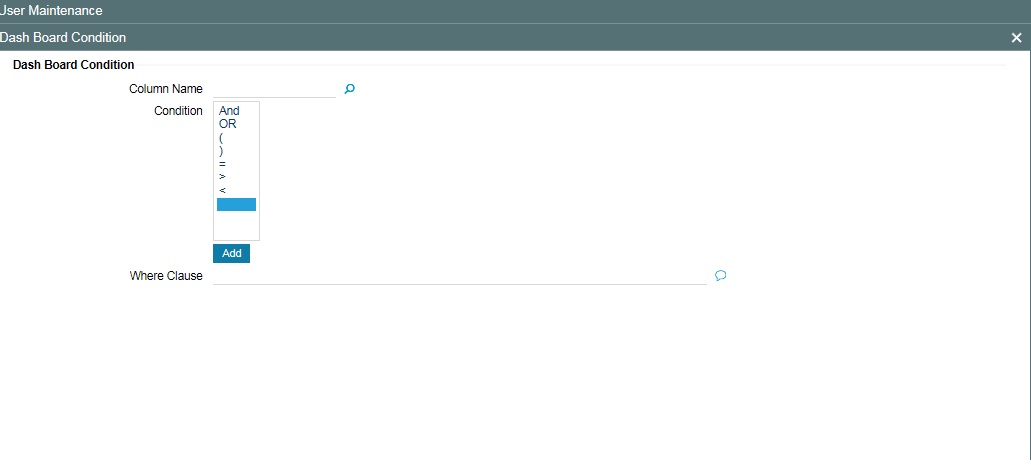 Click to invoke ‘Dashboard Condition’ sub-screen. You can maintain filter conditions for each DFI the ‘User’ is mapped to.