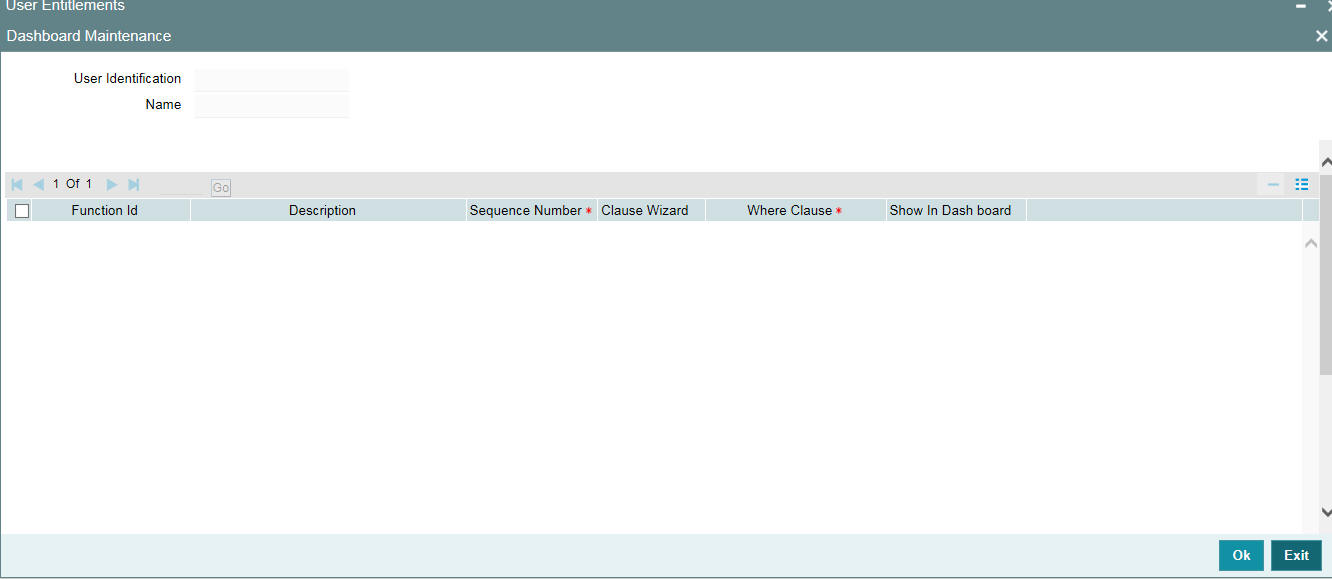 If you checked the ‘Show Dashboards’ check box in the main page of the ‘User Maintenance’ screen, then you can map the specified ‘User’ to one are more Dashboards in the ‘Dashboard Maintenance’ sub-screen. Click ‘Dashboard Mapping’ button to invoke this screen.