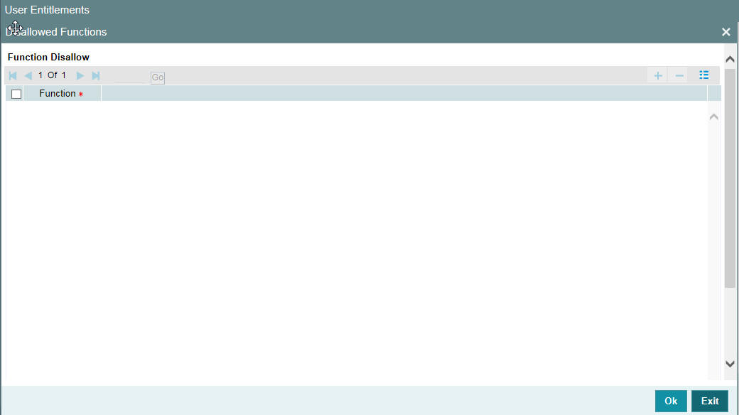 You can restrict certain functions from being performed by a user. You can specify such restrictions in the ‘Disallowed Functions’ screen. Click ‘Disallowed Functions’ button to invoke this screen.