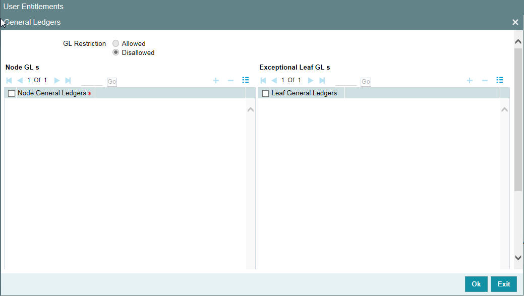 You can restrict the user from posting entries to certain General Ledgers (GLs) maintained in Oracle Banking Payments Further, you can restrict the user from posting entries to specific node GLs and Leaf GLs. Leaf GLs maintained in the section ‘Exception Leaf GLs’ will be excluded from this restriction. Click ‘General Ledgers’ button to specify the GL restrictions.