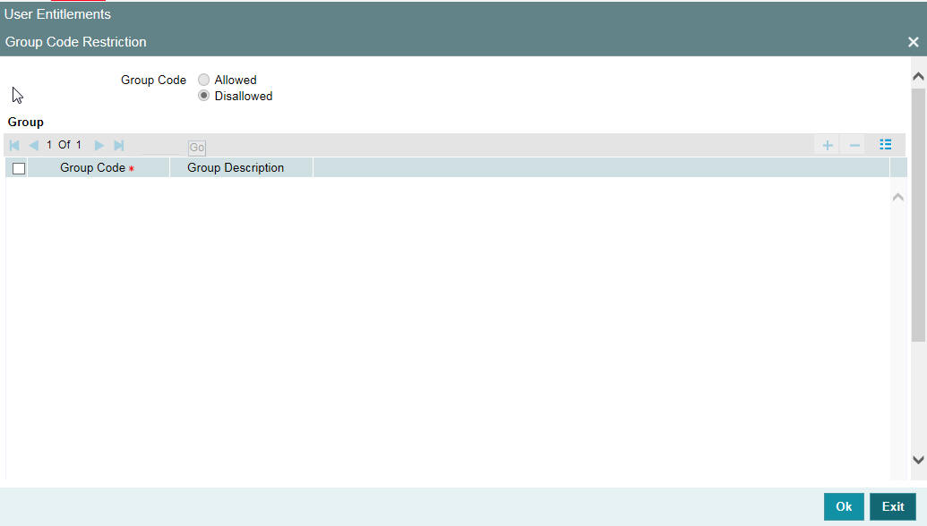 Specify group code which is allowed or disallowed for the Oracle Banking Payments user. You can select any or all of the following: