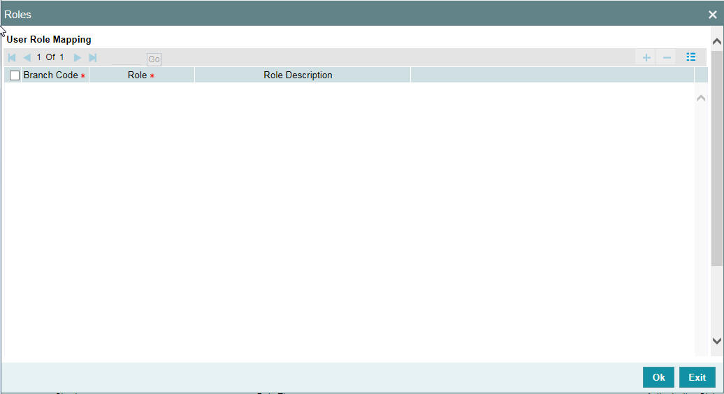 Specify the role assigned to the user for the selected branch. The option list displays all valid roles maintained in the system. Choose the appropriate one.