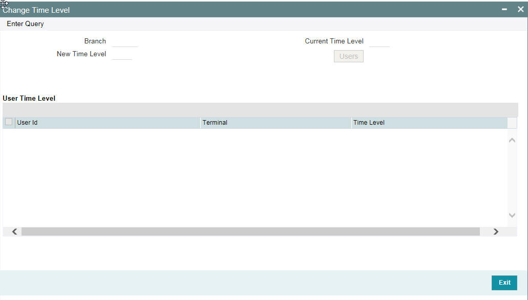 You can change time level of the branch by using the ‘Change Time Level’ screen. You can invoke this screen by typing ‘SMDCHGTL’ in the field at the top right corner of the Application tool bar and clicking on the adjoining arrow button. Click ‘Users’ button for a display of the details of users who are currently logged in.