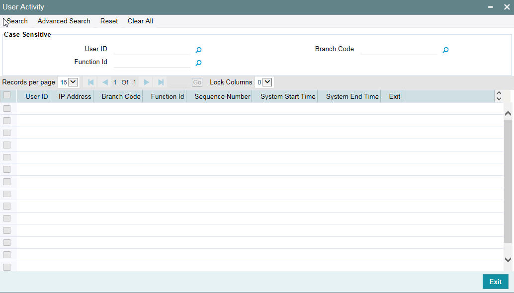 You can view a log of activities of Oracle Banking Payments users through the ‘User Activity’ screen. You can view user activities only through Oracle Banking Payments host system. This screen is not available for viewing in the branch installations. You can invoke this screen by typing ‘SMSUSRAC’ in the field at the top right corner of the Application tool bar and clicking on the adjoining arrow button.