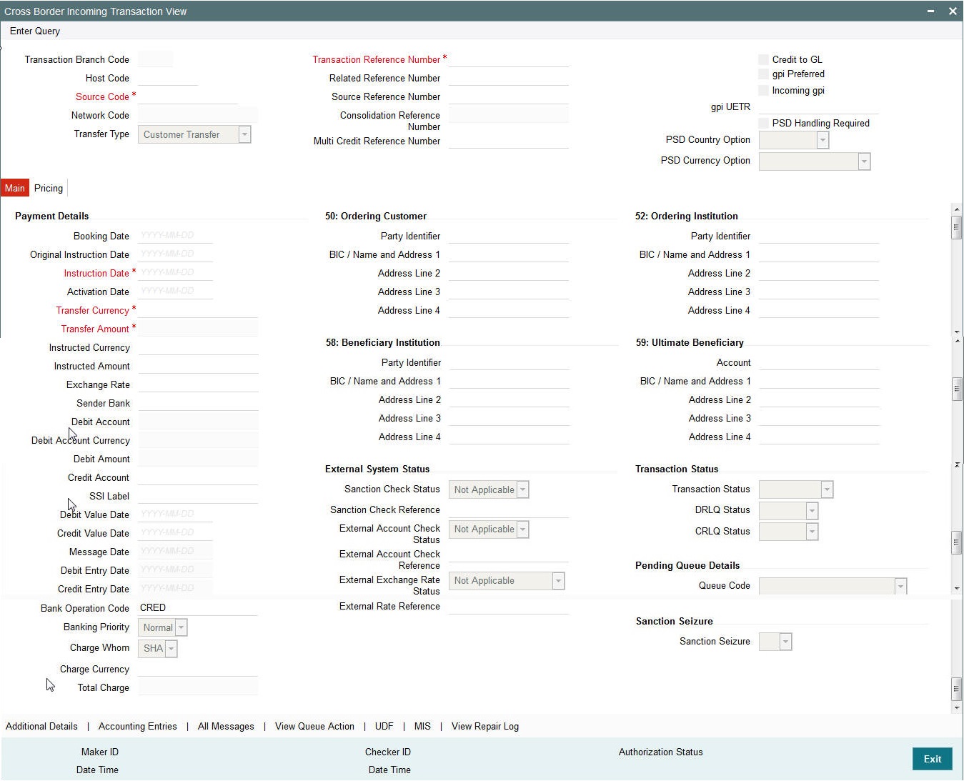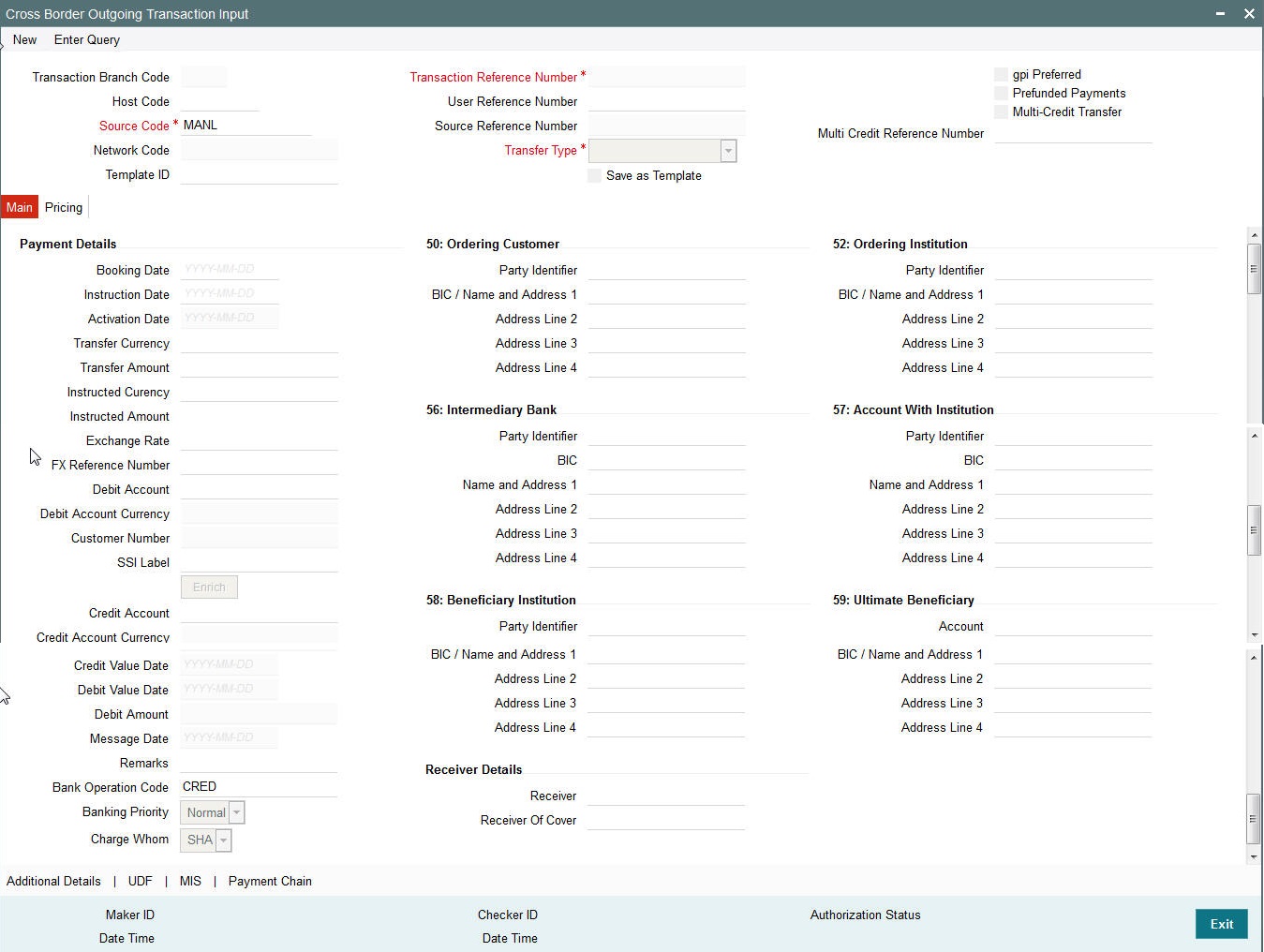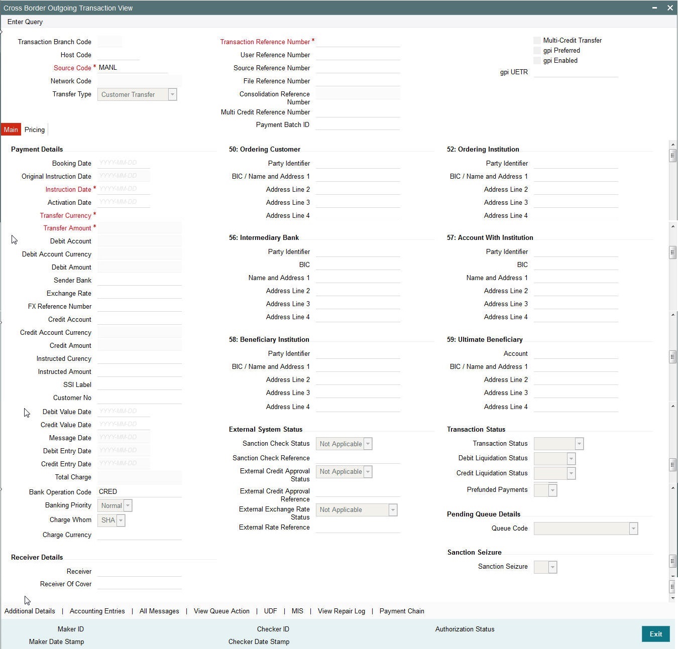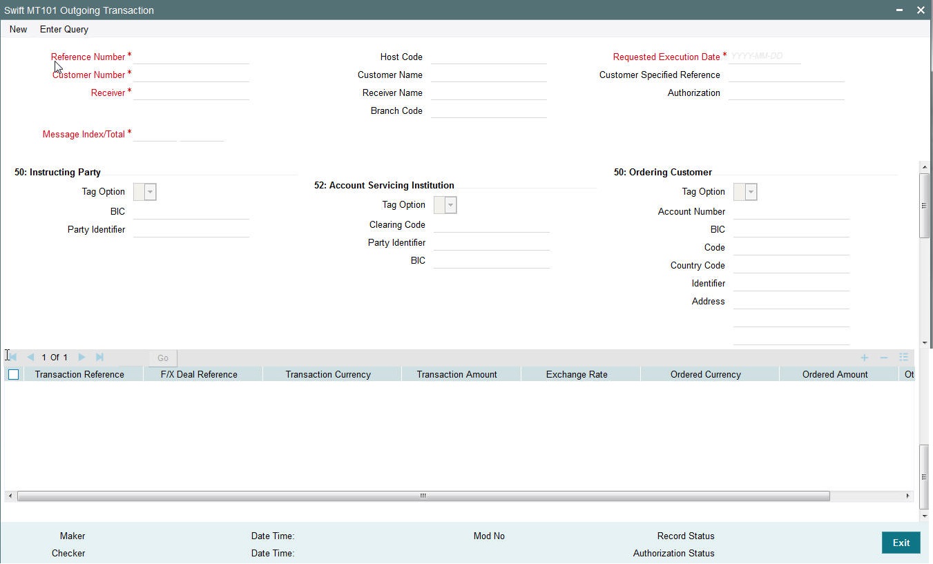 You can book an outgoing SWIFT payment by providing input for the payment transaction in this screen. Input can be provided for a new transaction using the already saved template. Some Transaction fields are applicable only to the specific transfer type (Customer / Bank Bank transfer - Own Account).