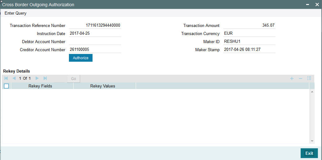 System displays auto-generated Transaction reference number. For more details on the format, refer the Payments Core User Guide.