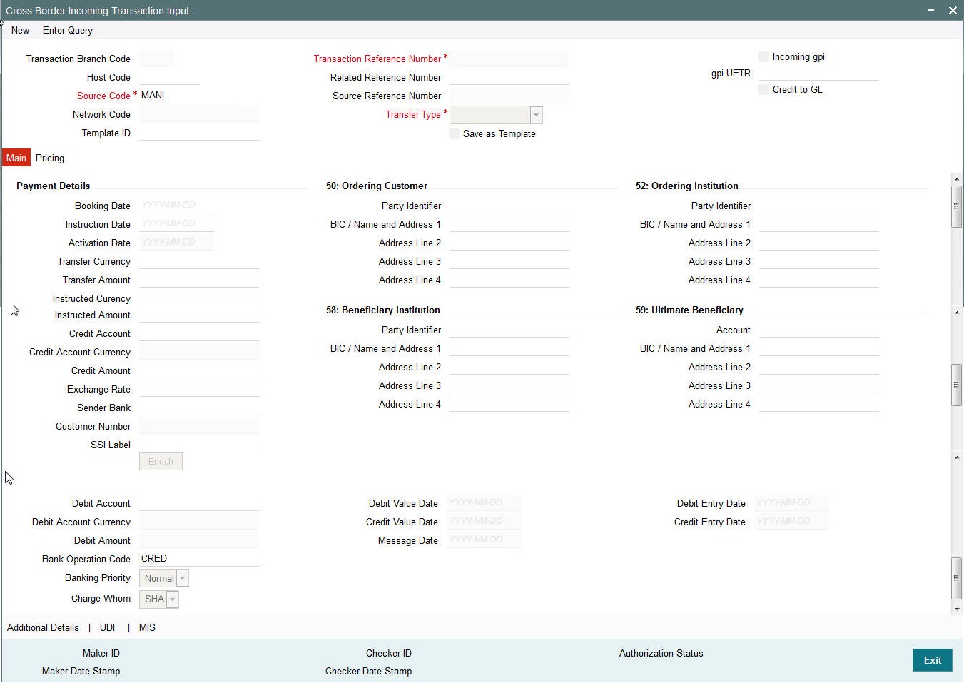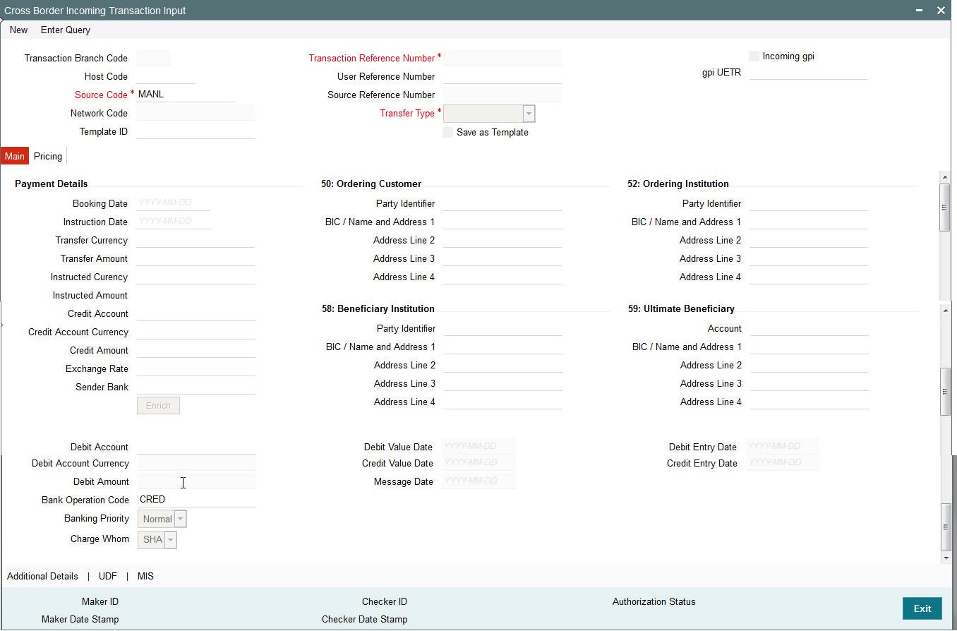 This is applicable only for ‘Customer Transfer’ type of transaction. The ordering customer details including name and address are defaulted based on the debit account selected. However you can modify these details.
