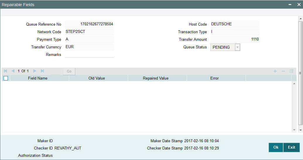 | Repair | This action enables you to modify the payment details and submit for re-processing. On completion of repair action, transaction is re-processed, starting from initial validations. | Note: You are allowed to modify predefined list of fields each payment type. | ||