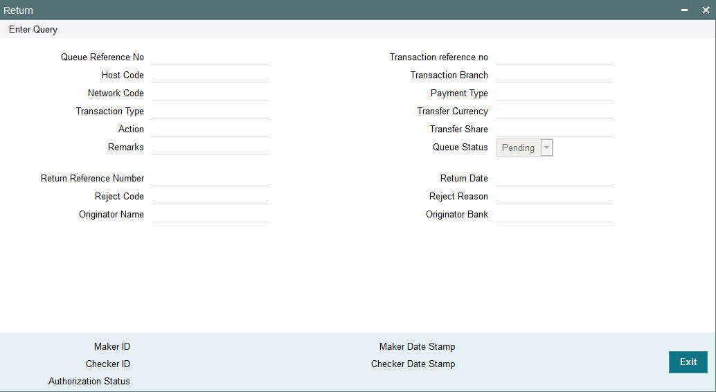 Exception queues are a logical stage of the payment processing where the payments are made available for further investigation or exception processing. If any exception is encountered during processing, payment transactions are moved to a queue specific to the type of exception. Actions that can be performed on a payment that is pending in a queue are predefined. Transactions with exceptions, pertaining to your logged in Host only are listed in the Queues.
