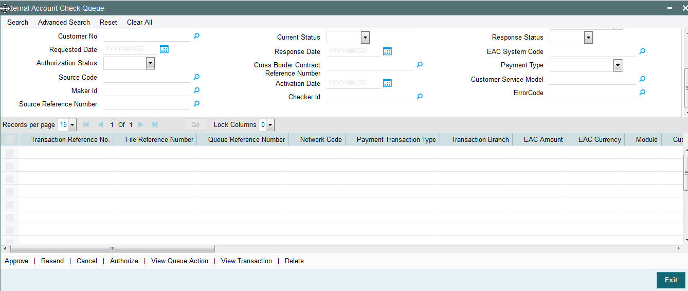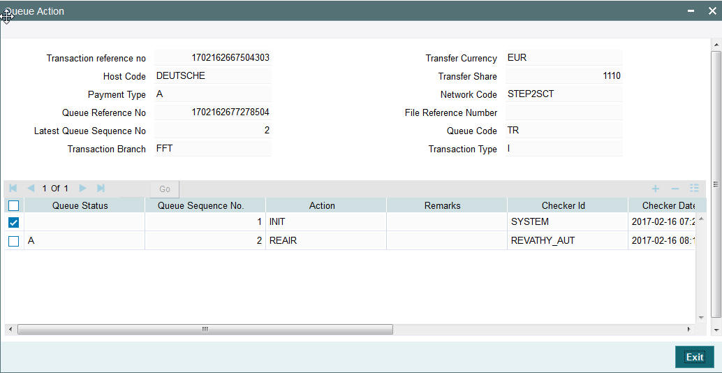 | View Transaction | You can select a particular transaction in this queue and click this action button. The screen display the transaction details in the View screen of the applicable payment type. | ||