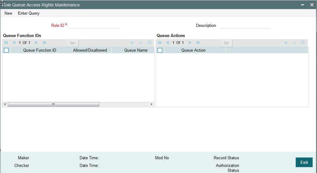 You can invoke the ‘Role Queue Access Rights’ screen by typing ‘PMDUSRQA’ in the field at the top right corner of the application toolbar and clicking the adjoining arrow button.Click new button on the Application toolbar.