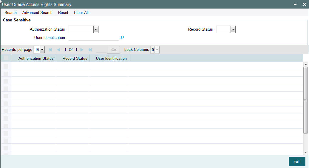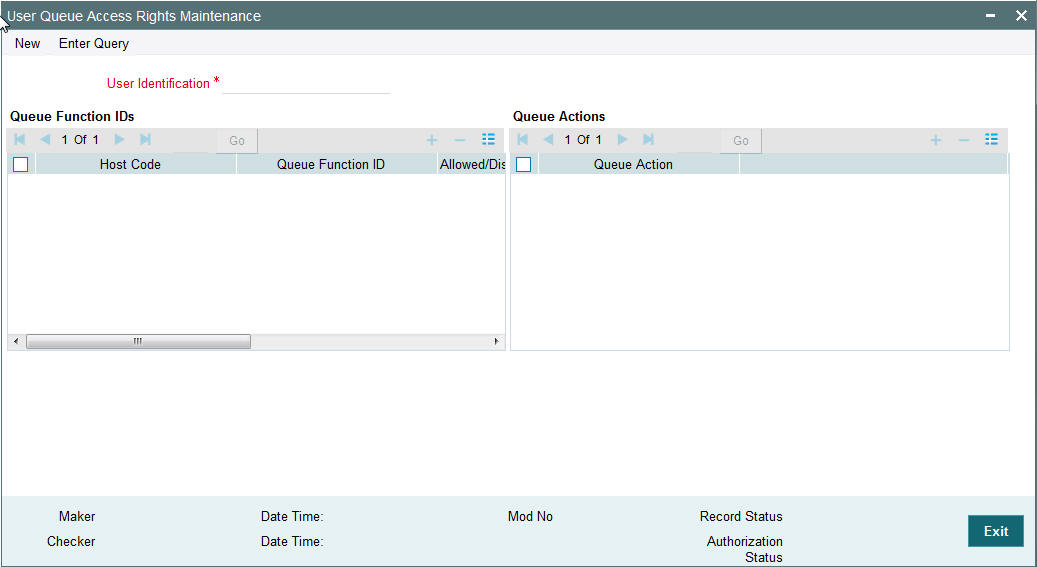 You can invoke “User Queue Access Rights Summary” screen by typing ‘PMSUSRQA’ in the field at the top right corner of the Application tool bar and clicking on the adjoining arrow button. Click new button on the Application toolbar.