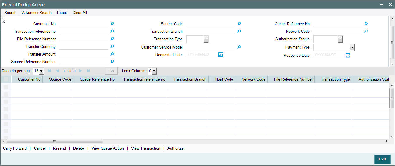 You can invoke the External Pricing Queue Screen by typing ‘PQSEXPRQ’ in the field at the top right corner of the application toolbar and clicking the adjoining arrow button. Click new button on the Application toolbar.