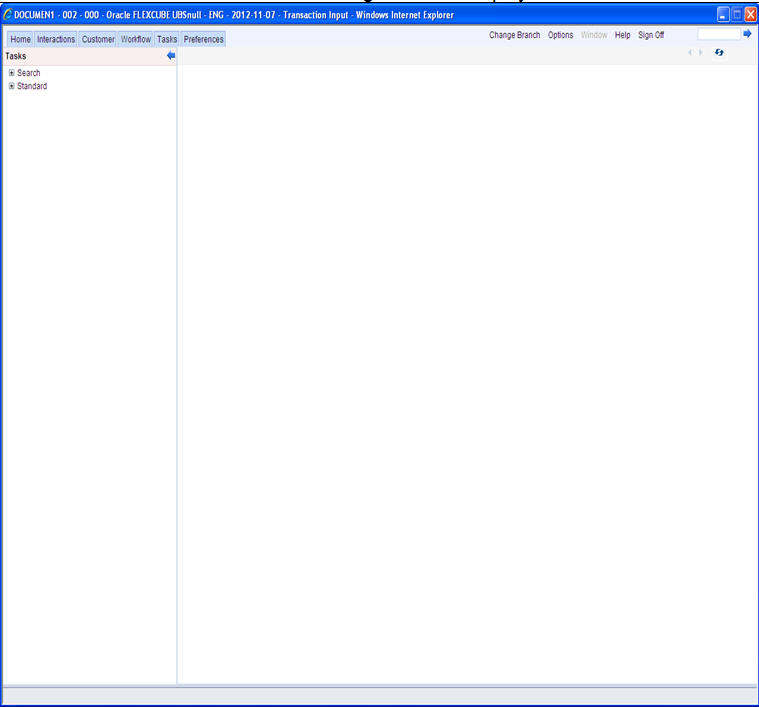 The system displays all the main menu items that you have maintained in the ‘Landing Page Configuration’ screen along with the ‘Search’ and ‘Standard’ main menu items on the left hand side of the screen.