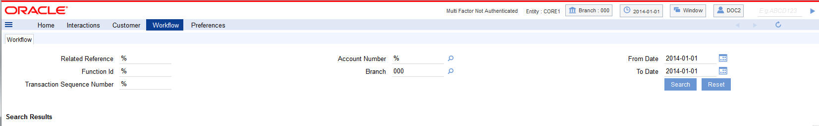 You can query existing workflow tasks by clicking ‘Search’ and then choosing the relevant link under it. Under ‘Search’, you are provided the option of searching tasks across all process flows (the ‘All’ link) or for specific process flows. The fields available under the link ‘All’ are pre-defined in the system and the link ‘All’ is readily available. The other process flow specific links are displayed only if you maintain them in the ‘Landing Page Configuration’ screen.