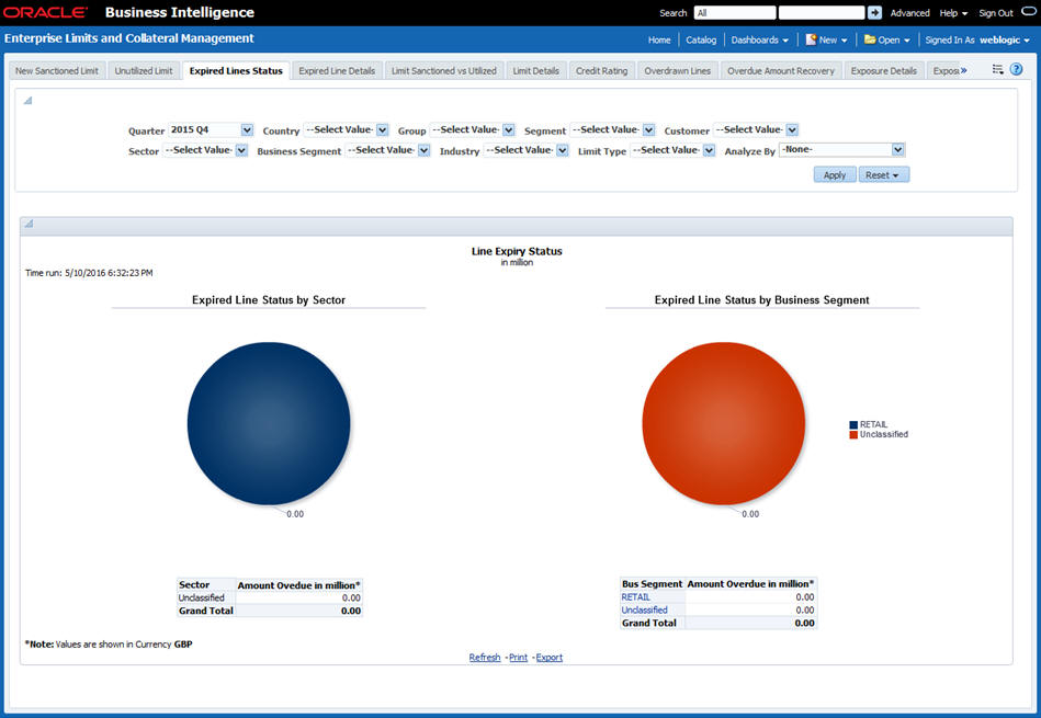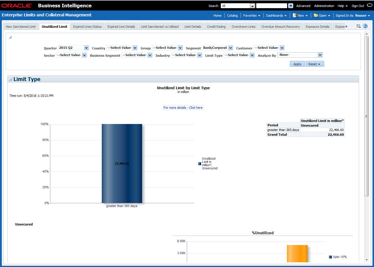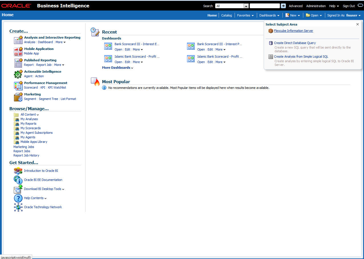 You can generate the various preset reports from Oracle FLEXCUBE Information Server. Login to Oracle Business Intelligence Enterprise Edition. Go to Dashboards. The reports are organized under four dashboards, viz. Bank Scorecard I, Bank Scorecard II, Bank Scorecard III/ Islamic, and Enterprise Limits and Collateral Management.