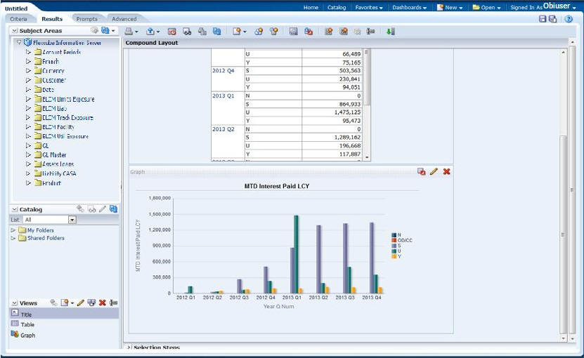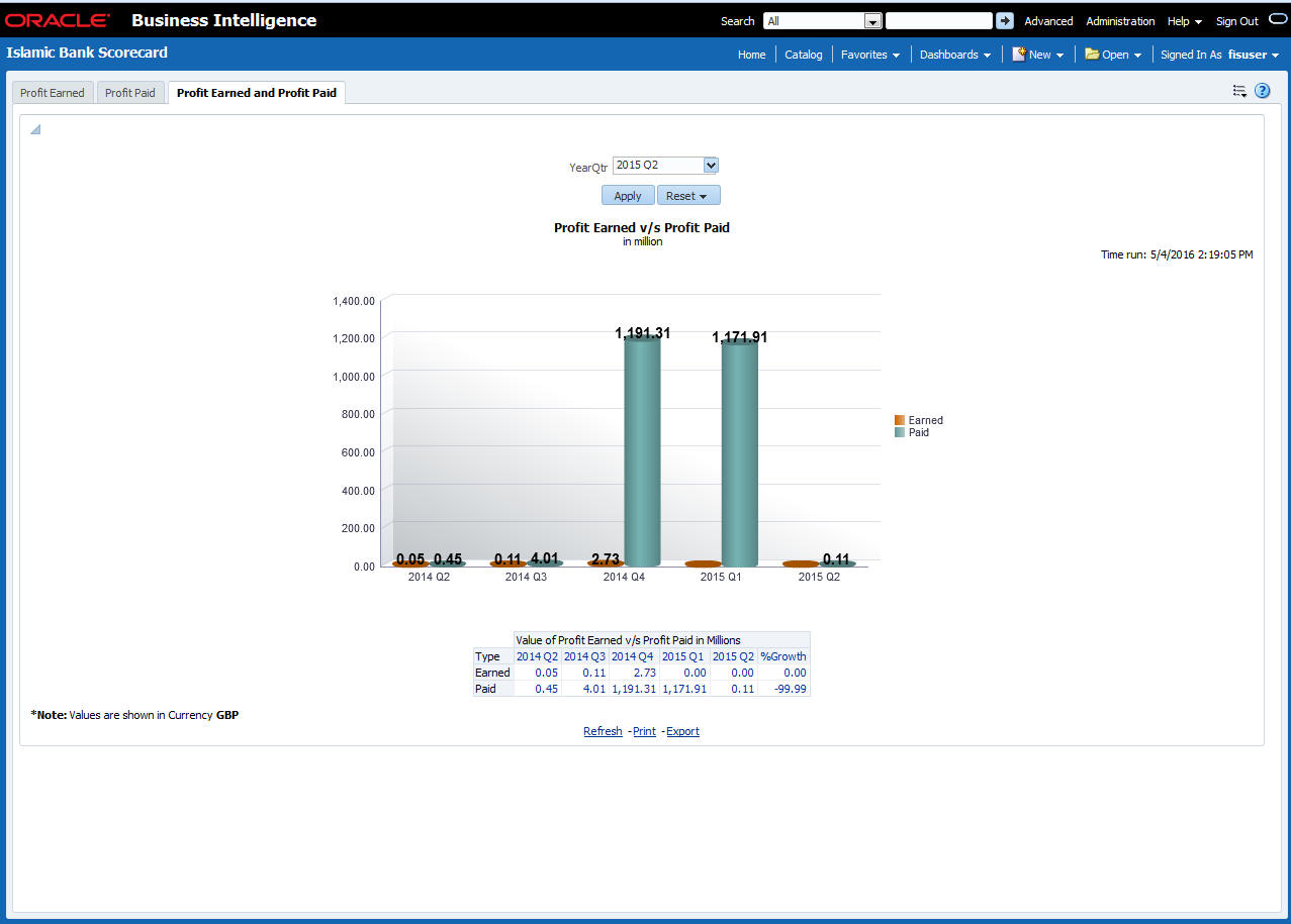 Oracle Business Intelligence system displays the reports for the selected year quarter. It also shows the data pertaining the previous four year quarters. You can drill down to the account level by clicking the data.