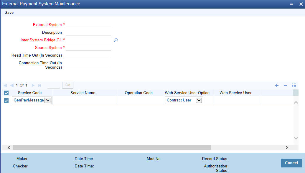 Select the service code from the drop-down list. The list displays ‘GenPayMessage’ value which indicates single payment service.