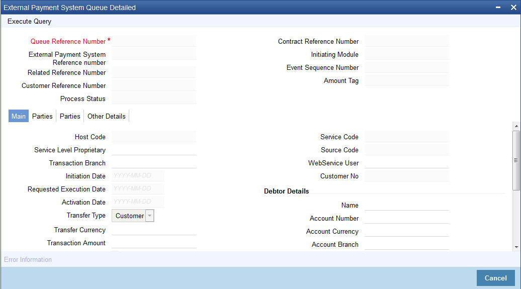 Specify the queue reference number and click ‘Execute Query’ to view the details of payment request sent to external payment system.