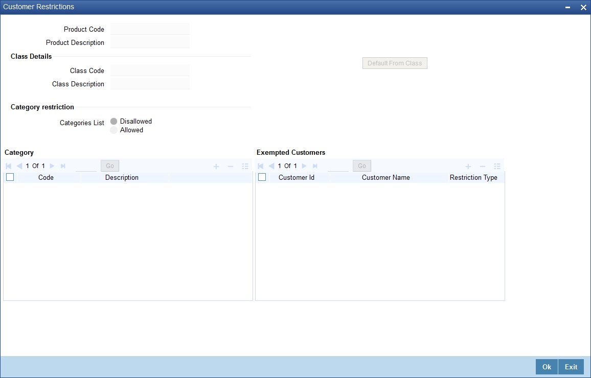 Click the ‘Customer’ button to invoke the ‘Customer Restriction’ screen. Through this screen you can manage customer details you are creating.