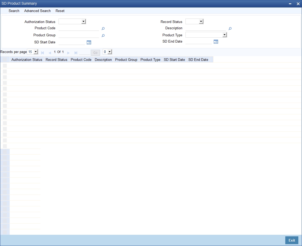 You can search for the SD Products in the ‘SD Product Summary’ screen. You can invoke this screen by typing ‘SFSPRODT’ in the field at the top right corner of the Application tool bar and clicking on the adjoining arrow button.