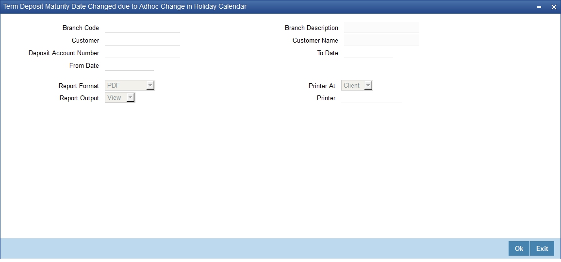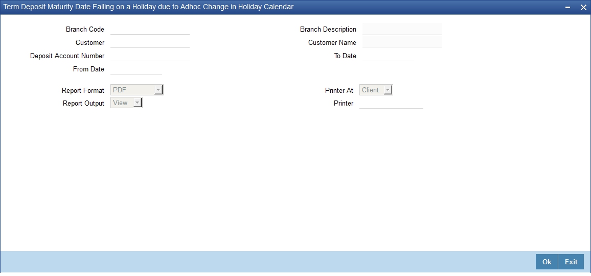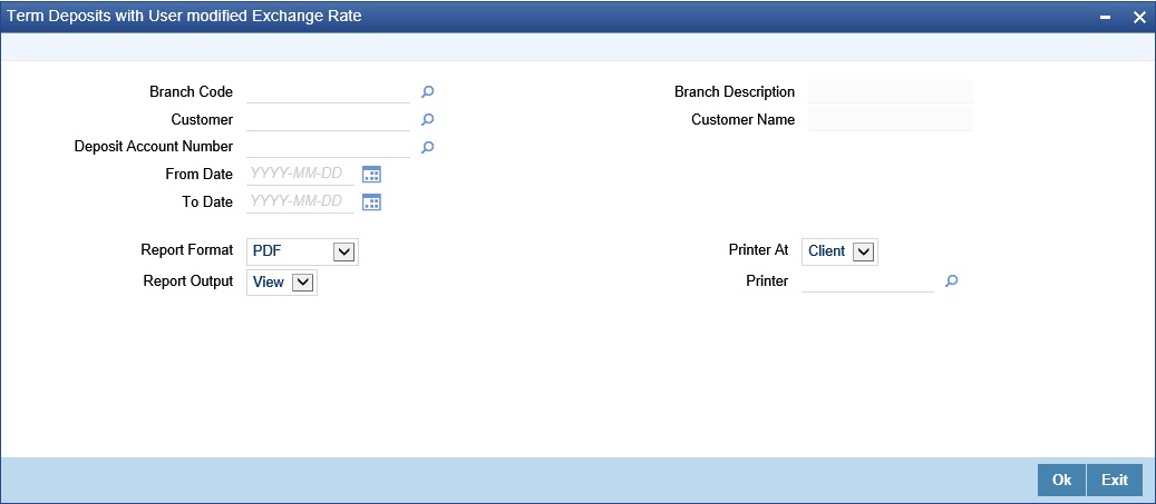 You can generate a report that shows the details of all Term Deposits where the rate is modified by the user in the pay-out or pay-in grid. So all Term Deposits where Original and Applied Exchange Rate are different they are displayed in this Report. You can invoke this screen by typing ‘TDRRTMOD’ in the field at the top right corner of the application tool bar and clicking on the adjoining arrow button.