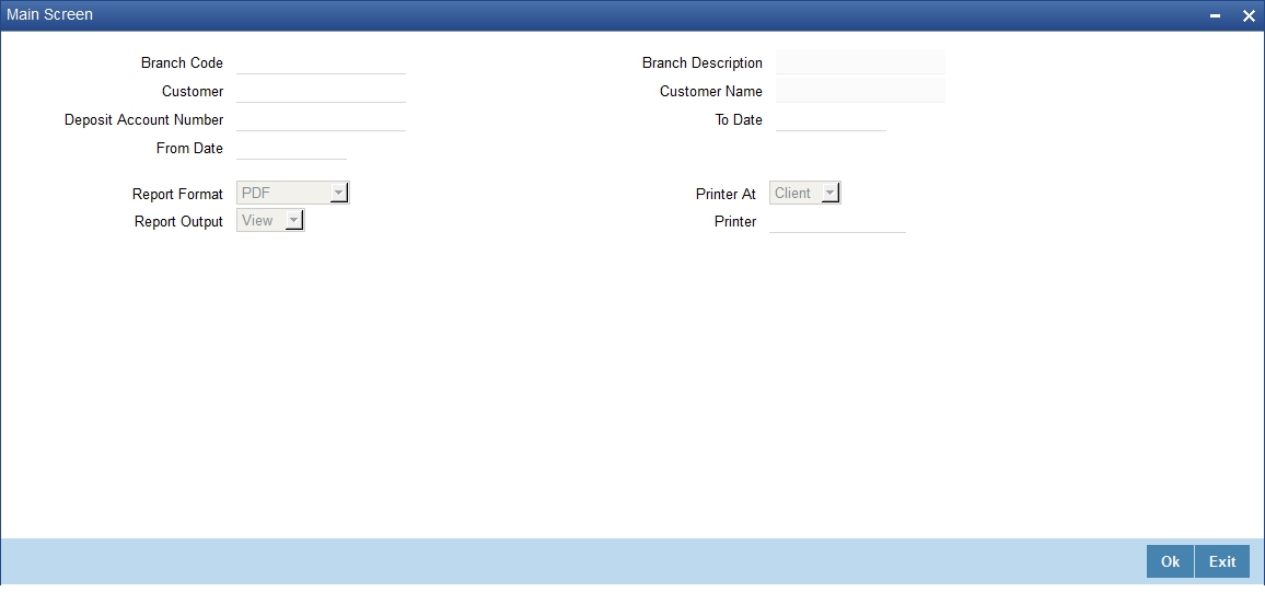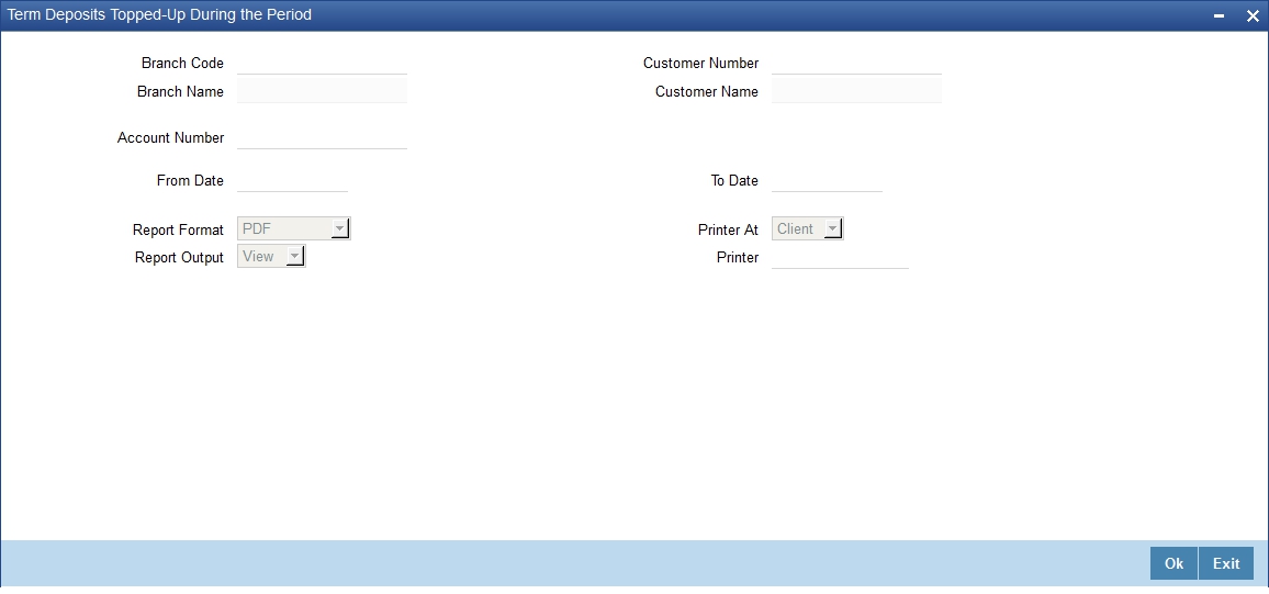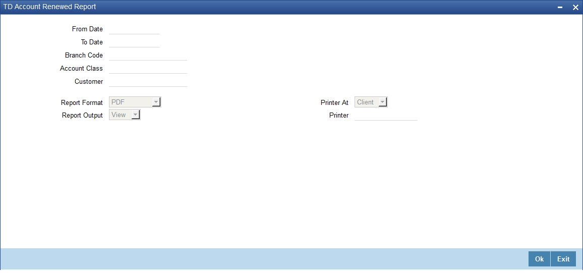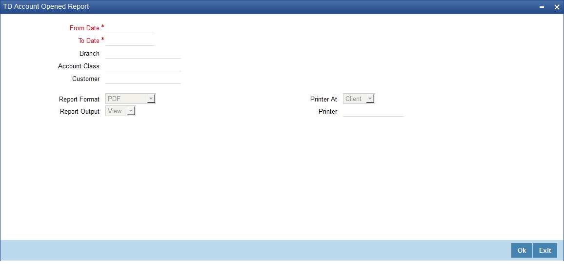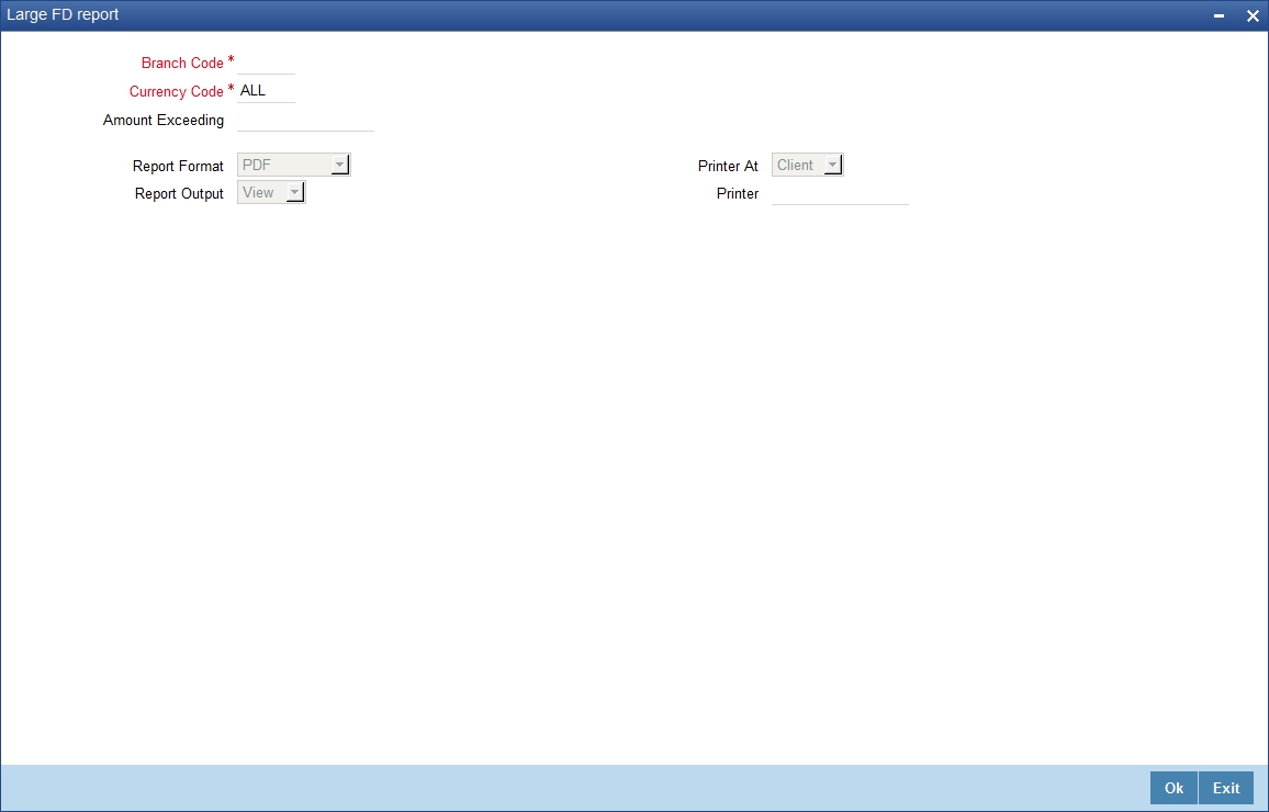 Select the branch code for which the report needs to be generated, from the adjoining option-list. The list displays all valid branch codes. You have an option to select all the branches or a single branch. If the branch code is not specified, then the TD accounts of all the branches are shown in the report.