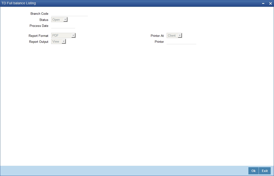 You can invoke ‘TD Full Listing Reports’ screen by typing ‘TDRFULBL’ in the field at the top right corner of the Application tool bar and clicking on the adjoining arrow button.