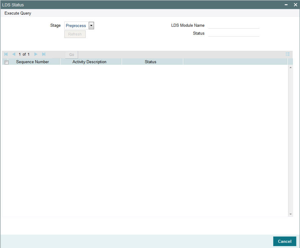 You can view the pre-process execution status in ‘LDS Status’ screen. You can invoke this screen by typing ‘LDDVWSTA’ in the field at the top right corner of the Application tool bar and clicking on the adjoining arrow button. The ‘LDS Pre Process’ screen is displayed. Select ‘New’ from the Actions menu in the Application tool bar or click new icon to enter the details.