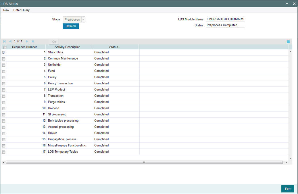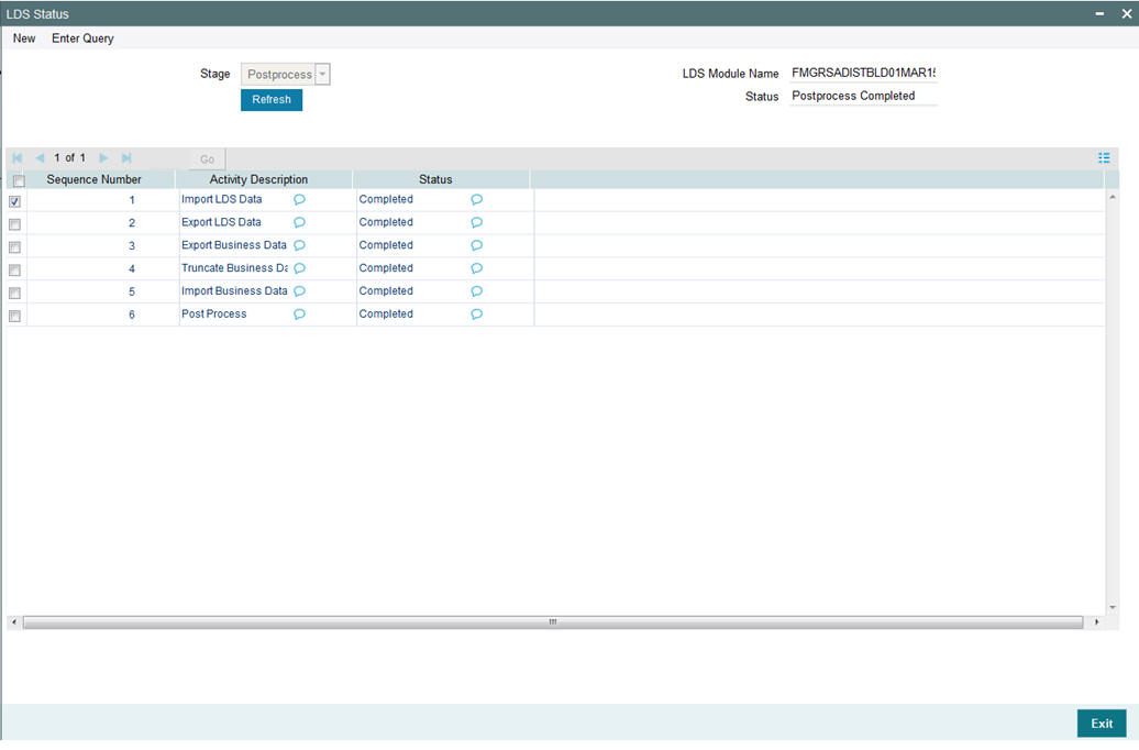 You can view the post process status in LDDVWSTA screen as mentioned above by selecting the stage as ‘Post Process’ and click ‘Enter Query’. The system displays the status of each activity. Click ‘Refresh’ button to refresh the status.