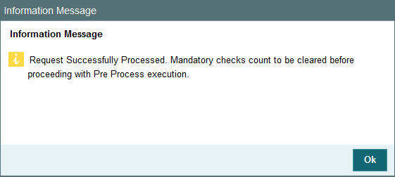Click ‘Preprocess Check’ button to validate the cut-off date. Click ‘Preprocess Check’ button, the system will execute few check queries and return the count. Once the request is successful, the following confirmation window is displayed.