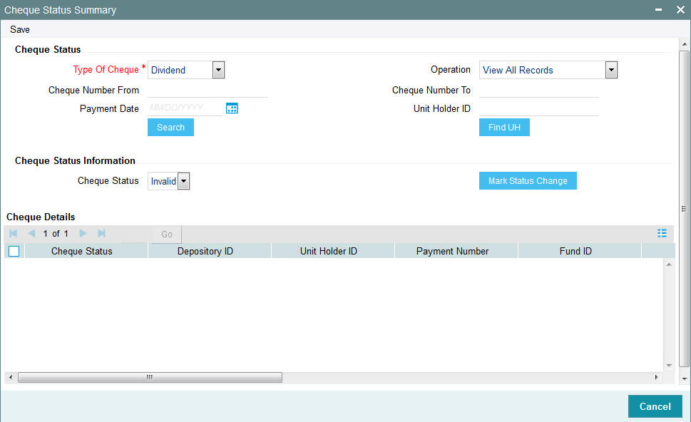 Specify the type of cheque for which you wish to view details or change the status.