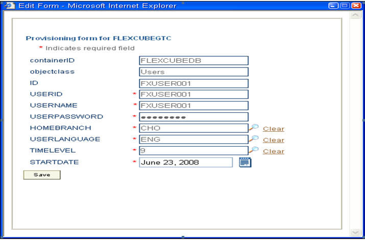The ‘Provisioning form for Oracle FLEXCUBE GTC’ is filled up by the OIM Administrator. OIM Administrator uses Direct Provisioning to provision Oracle FLEXCUBE to any OIM user.