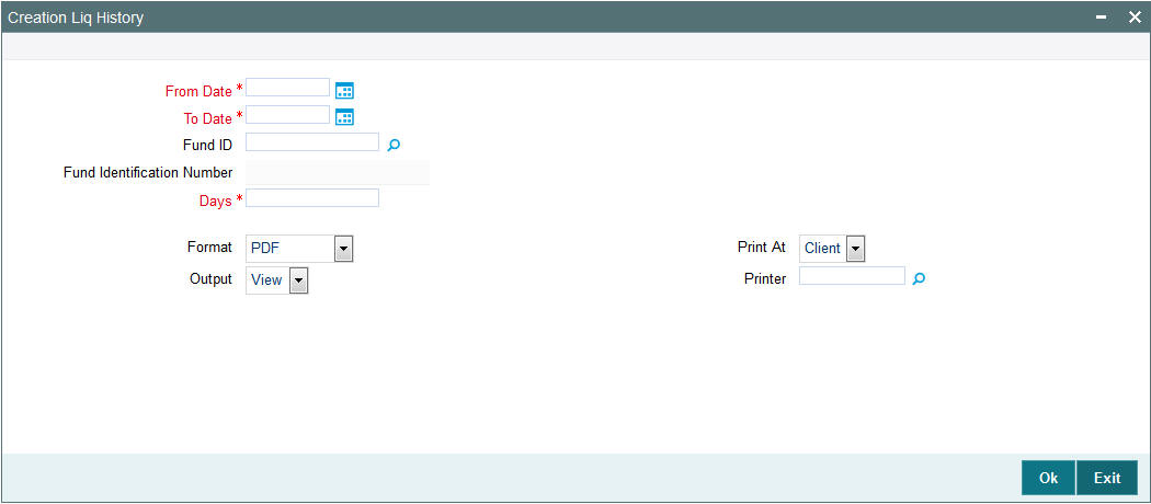 The ‘Creation Liq Details’ screen allows you to enter search criteria for the generation of a Creation/Liquidation Trading Report. You can invoke this screen by typing ‘UTR00210’ in the field at the top right corner of the Application tool bar and clicking on the adjoining arrow button.