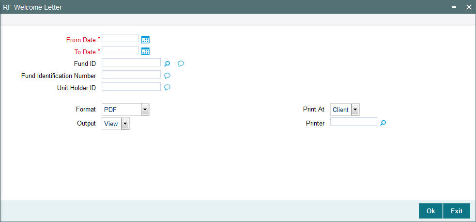 You can generate welcome letter using ‘Welcome Letter’ screen. You can invoke this screen by typing ‘UTR00230’ in the field at the top right corner of the Application tool bar and clicking on the adjoining arrow button.