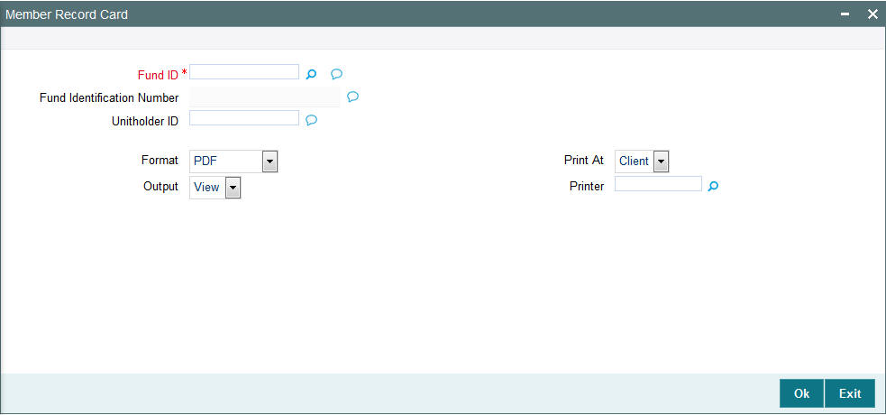 You can generating member record card using ‘Member Record Card’ screen. You can invoke this screen by typing ‘UTR00256’ in the field at the top right corner of the Application tool bar and clicking on the adjoining arrow button.