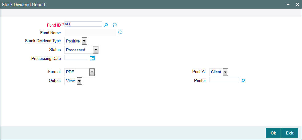 You can generate stock dividend report using ‘Stock Dividend Report’ screen. You can invoke this screen by typing ‘UTR00310’ in the field at the top right corner of the Application tool bar and clicking on the adjoining arrow button.